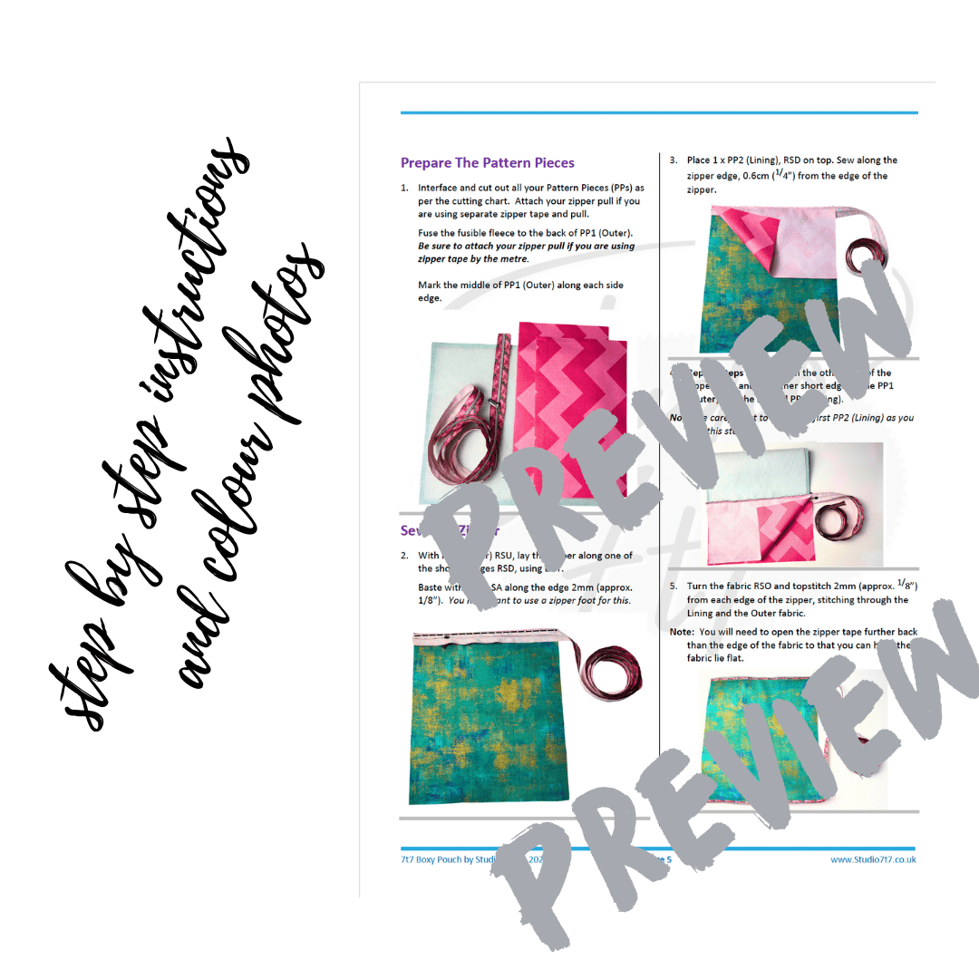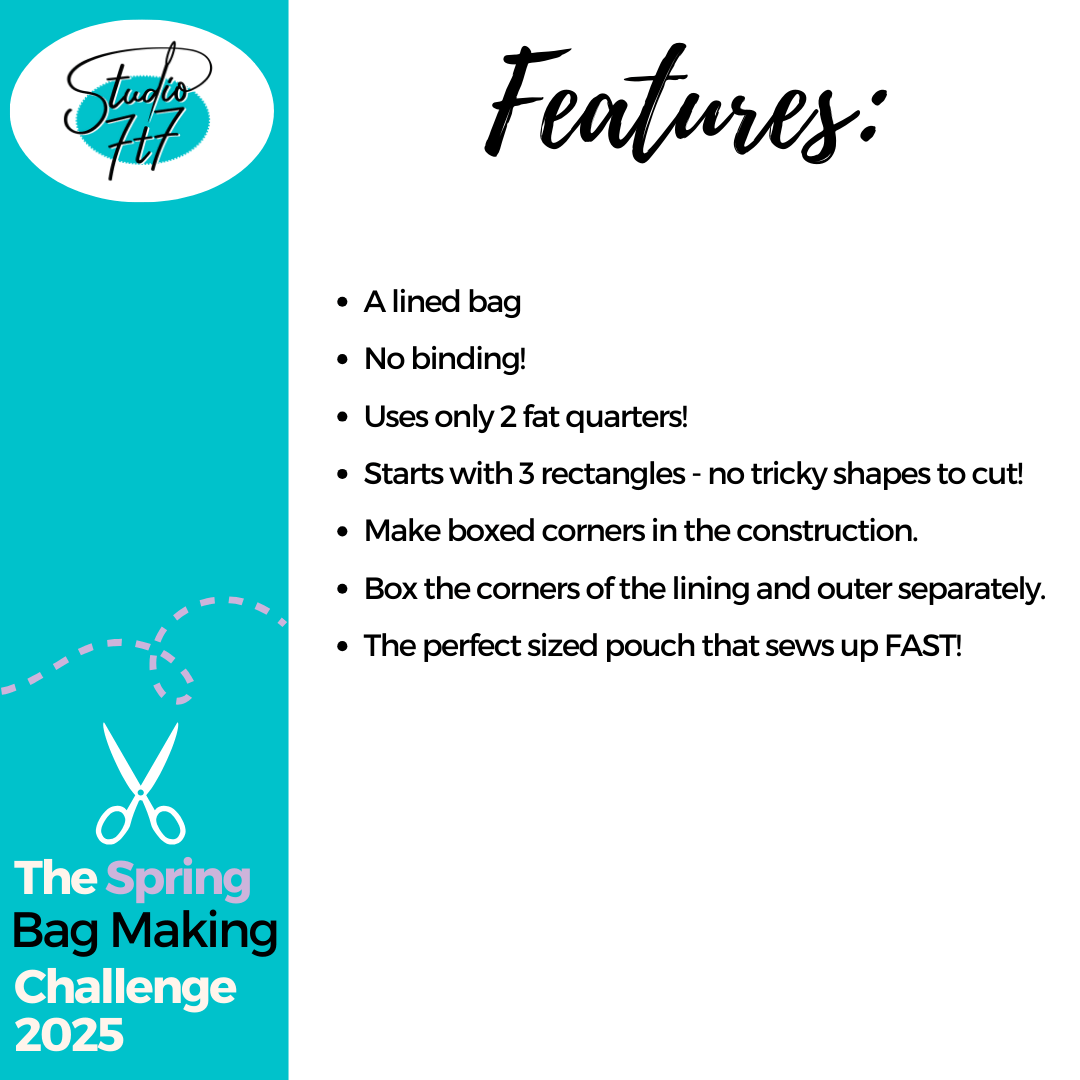 The 7t7 Boxy Pouch is from the free tutorial led pop up challenge in April 2025. Designed to be sewn via the cutting measurements on the video, this pdf download was created as a quick reference due to previous challenge requests.